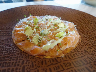 - · Salmon Tostados : Salmon sashimi served over tortilla with creamy spicy green sauce on top (we can taste wasabi is present in the sauce). This dish is also good, as creamy and crunchy texture are both present, while the fish is also very fresh.